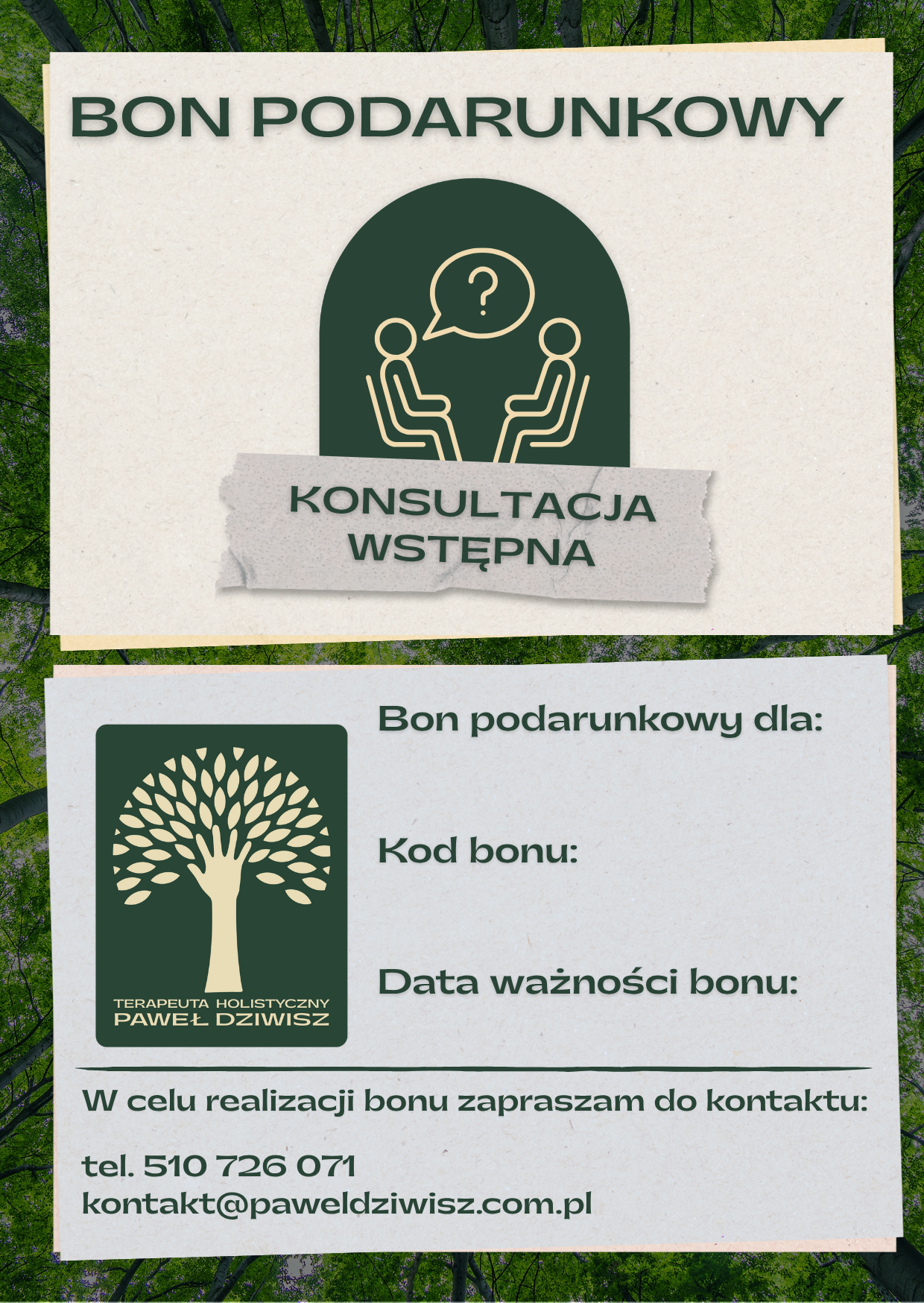 Bon podarunkowy dostępny w naszym sklepie to idealny sposób na wyjątkowy prezent, przypisany do konkretnej terapii lub usługi. Bon jest ważny przez 12 miesięcy od daty zakupu i może zostać zrealizowany w dowolnym miejscu wybranym przez obdarowanego, po wcześniejszym telefonicznym lub mailowym umówieniu terminu realizacji. Dzięki temu osoba obdarowana ma pełną swobodę wyboru dogodnego czasu i miejsca, co sprawia, że korzystanie z bonu jest wygodne i elastyczne..